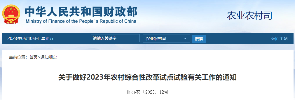 為深入貫徹黨的二十大精神,認(rèn)真落實(shí)2023年中央一號(hào)文件“深化農(nóng)村改革”、“深入推進(jìn)農(nóng)村綜合改革試點(diǎn)示范”的任務(wù)要求和中共中央、國務(wù)院印發(fā)的《數(shù)字中國建設(shè)整體布局規(guī)劃》部署,在總結(jié)前期試點(diǎn)經(jīng)驗(yàn)的基礎(chǔ)上,2023年中央財(cái)政繼續(xù)支持實(shí)施并啟動(dòng)新的農(nóng)村綜合性改革試點(diǎn)試驗(yàn)(以下簡(jiǎn)稱試點(diǎn))。現(xiàn)就有關(guān)工作通知如下。