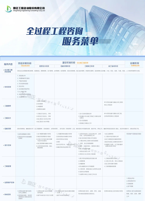 鼎正咨詢資質(zhì)資信及業(yè)務能力已覆蓋工程咨詢?nèi)a(chǎn)業(yè)鏈,可提供全過程工程咨詢、PPP全生命周期咨詢、項目策劃、工程投資咨詢 、土地利用規(guī)劃、城鄉(xiāng)規(guī)劃、工程設(shè)計、工程監(jiān)理、招標代理、政府采購、工程造價咨詢、BIM咨詢等服務。