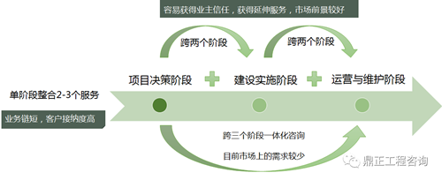 跨階段全過程程咨詢指提供跨兩個階段的服務,能實現(xiàn)項目管理+2項以上專業(yè)咨詢服務,容易獲得業(yè)主信任,獲得延伸服務,市場前景較好。