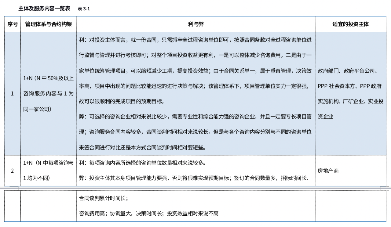 不同的投資主體所需的服務(wù)內(nèi)容和管理模式不一樣,就會導(dǎo)致項目管理體系上和合約構(gòu)架上不一樣,以下通過表格闡述不同的管理體系和合約構(gòu)架的利與弊及適宜的投資主體(本文倡導(dǎo)的全過程咨詢以項目管理為主線,用1表示,前期咨詢、監(jiān)理、造價、招標代理、勘察設(shè)計管理等用N表示):