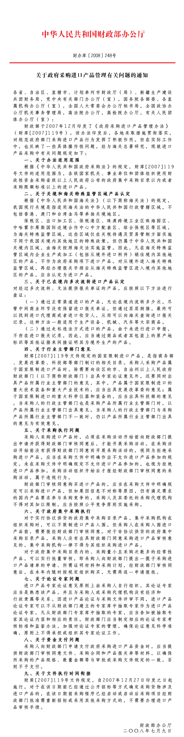 關(guān)于政府采購進口產(chǎn)品管理有關(guān)問題的通知(財辦庫〔2008〕248號)