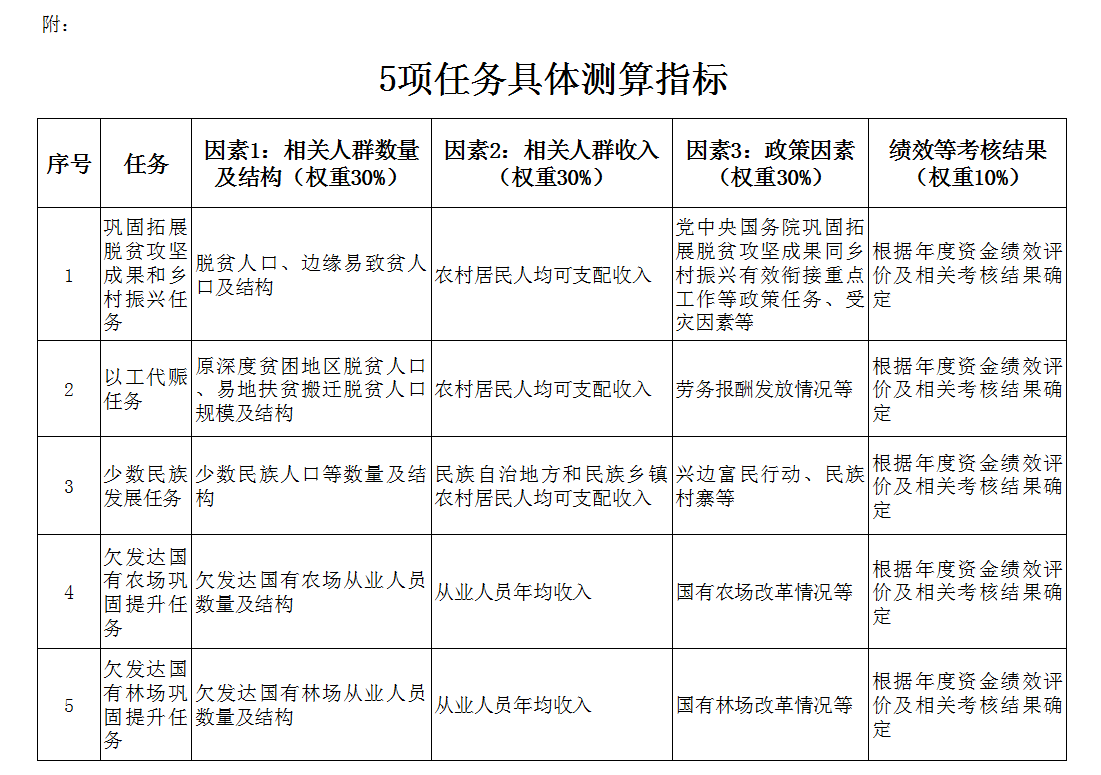 第二條 銜接資金按照鞏固拓展脫貧攻堅成果和鄉(xiāng)村振興、以工代賑、少數(shù)民族發(fā)展、欠發(fā)達國有農(nóng)場鞏固提升、欠發(fā)達國有林場鞏固提升、“三西”農(nóng)業(yè)建設任務進行分配。資金分配按照因素法進行測算,因素和權重為:相關人群數(shù)量及結構30%、相關人群收入30%、政策因素30%、績效等考核結果10%,并進行綜合平衡。各項任務按照上述因素分別確定具體測算指標(詳見附件)。“三西”農(nóng)業(yè)建設任務按照國務院批準的規(guī)模安排。