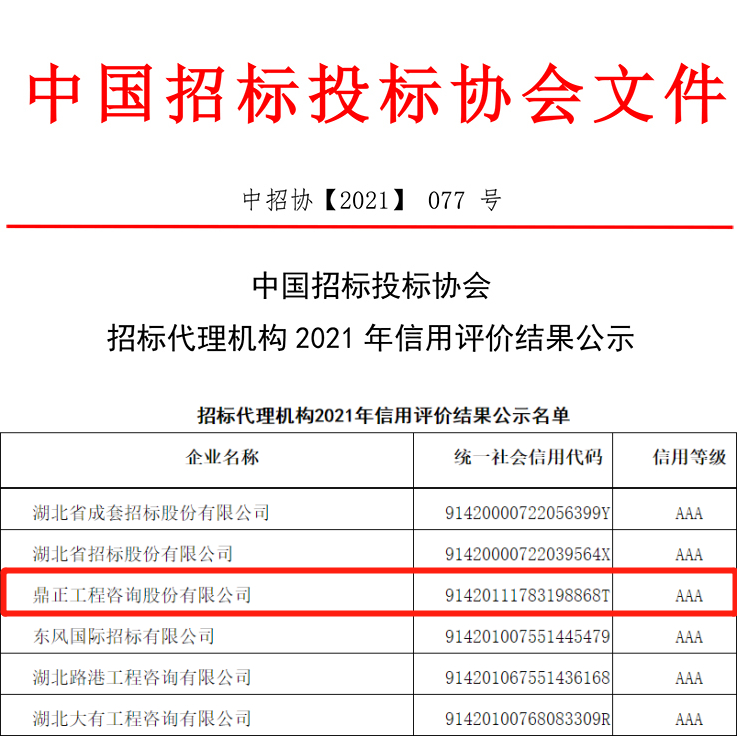 近日,中國招標投標協(xié)會頒布了招標代理機構2021年信用評價結果公示,鼎正工程咨詢股份有限公司繼獲得2021年度工程造價咨詢企業(yè)AAA信用評級后,再榮獲招標代理機構AAA信用評級!