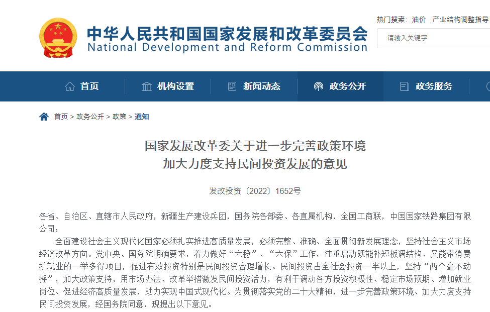 全面建設(shè)社會(huì)主義現(xiàn)代化國家必須扎實(shí)推進(jìn)高質(zhì)量發(fā)展,必須完整、準(zhǔn)確、全面貫徹新發(fā)展理念,堅(jiān)持社會(huì)主義市場經(jīng)濟(jì)改革方向。黨中央、國務(wù)院明確要求,著力做好“六穩(wěn)”、“六保”工作,注重啟動(dòng)既能補(bǔ)短板調(diào)結(jié)構(gòu)、又能帶消費(fèi)擴(kuò)就業(yè)的一舉多得項(xiàng)目,促進(jìn)有效投資特別是民間投資合理增長。民間投資占全社會(huì)投資一半以上,堅(jiān)持“兩個(gè)毫不動(dòng)搖”,加大政策支持,用市場辦法、改革舉措激發(fā)民間投資活力,有利于調(diào)動(dòng)各方投資積極性、穩(wěn)定市場預(yù)期、增加就業(yè)崗位、促進(jìn)經(jīng)濟(jì)高質(zhì)量發(fā)展,助力實(shí)現(xiàn)中國式現(xiàn)代化。為貫徹落實(shí)黨的二十大精神,進(jìn)一步完善政策環(huán)境、加大力度支持民間投資發(fā)展,經(jīng)國務(wù)院同意,現(xiàn)提出以下意見。