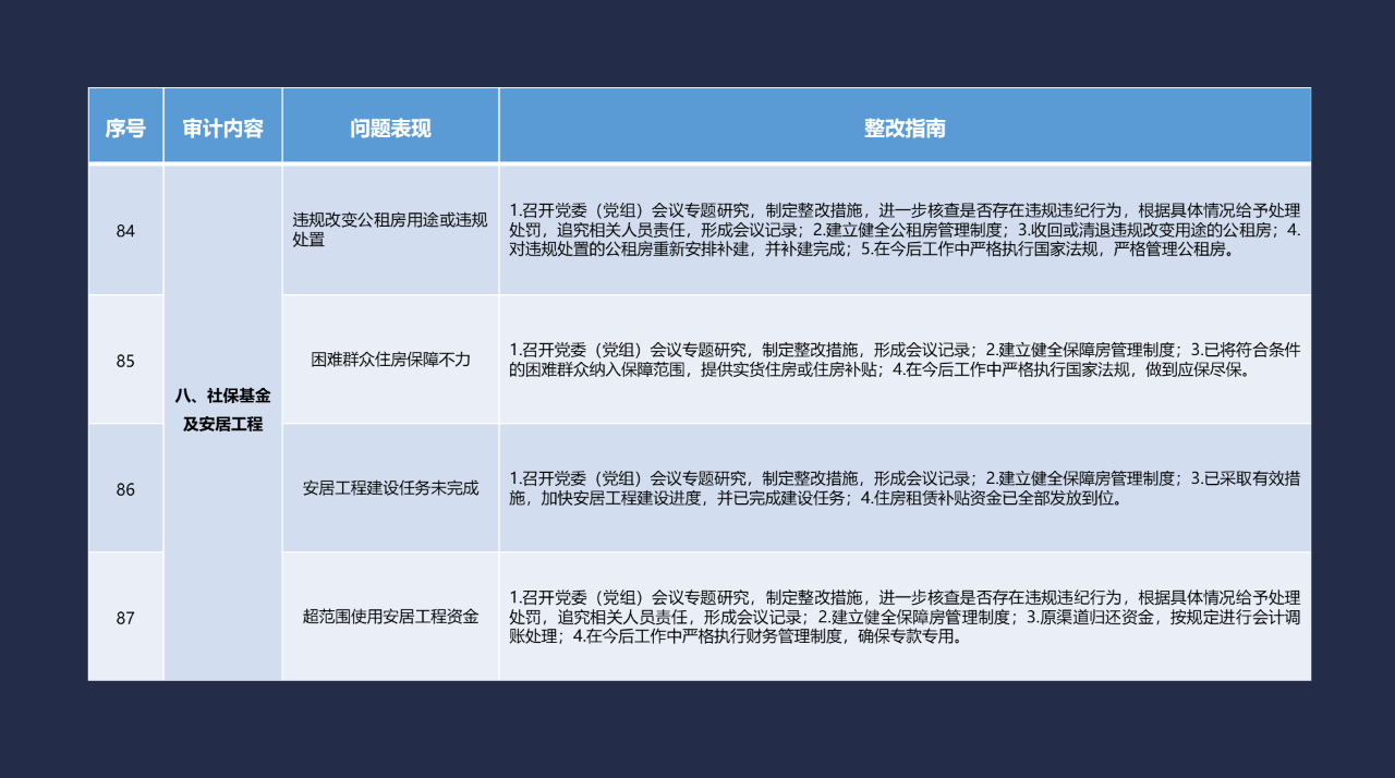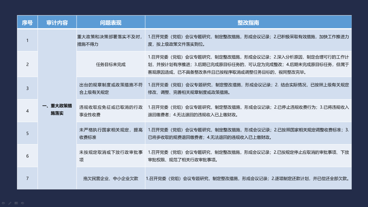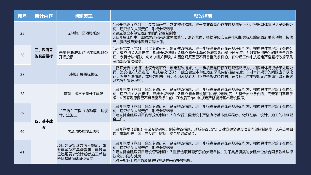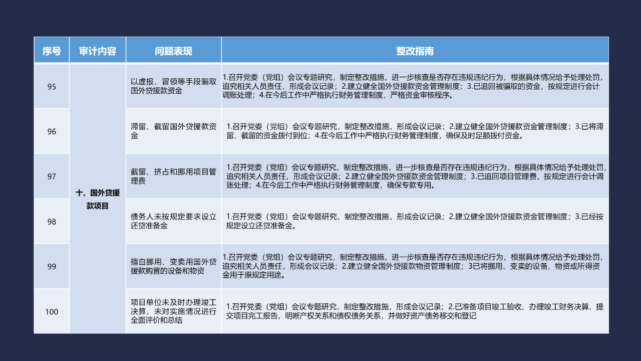 《整改指南100條》按照常見的重大政策措施落實、預算管理、政府采購及招投標、基本建設、內控管理、企業管理、自然資源、社保資金及安居工程、金融管理、國外貸援款共10類審計內容進行問題分類,列舉了100個常見問題并給出相對應的整改方法說明,供審計機關和整改責任單位在審計整改工作中參照落實。