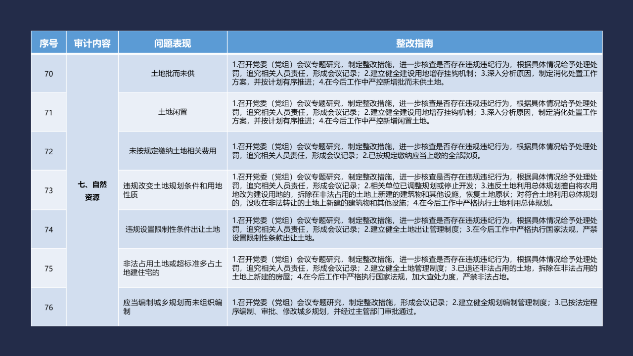 《整改指南100條》僅對審計整改的認定提供一般參考,每個問題的具體整改要求由審計機關在此基礎上依據審計事實、問題情節、產生后果,在審計報告及所附的《審計發現問題清單》中予以明確。涉及上級審計查出問題的整改情況按照上級審計機關有關要求進行落實。