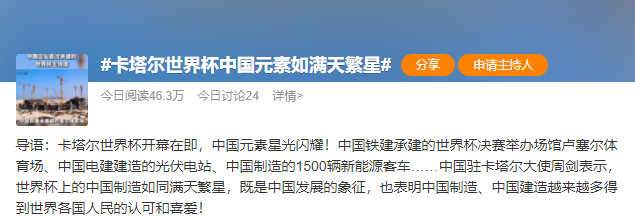 11月20日,2022年卡塔爾世界杯正式開幕。開幕式當(dāng)天,中國(guó)外交部發(fā)言人華春瑩在推特上連發(fā)8條推文,以圖文并茂的方式介紹世界杯“隨處可見的中國(guó)元素”。這也讓“卡塔爾世界杯中國(guó)元素如滿天繁星”的話題登上熱搜。