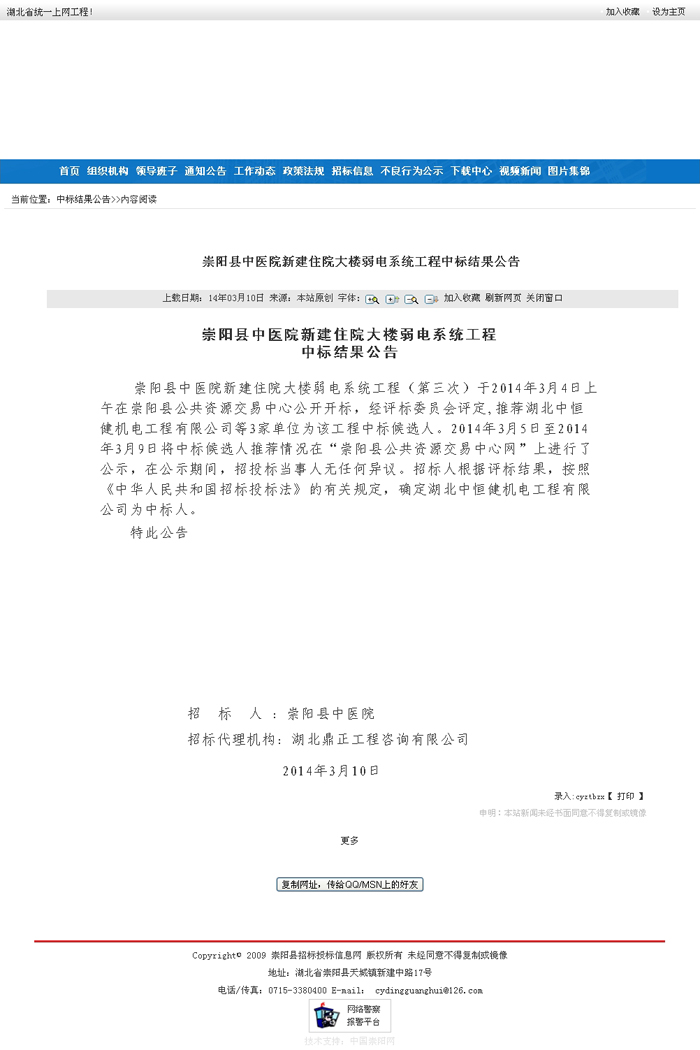 崇陽縣中醫(yī)院新建住院大樓弱電系統(tǒng)工程中標結(jié)果公告