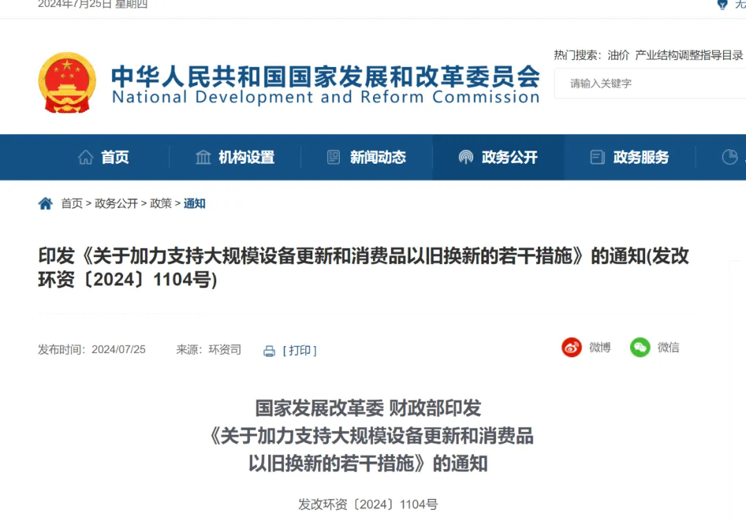 近日,國家發展改革委、財政部聯合印發《關于加力支持大規模設備更新和消費品以舊換新的若干措施》的通知(發改環資〔2024〕1104號),統籌安排3000億元左右超長期特別國債資金,加力支持大規模設備更新和消費品以舊換新。