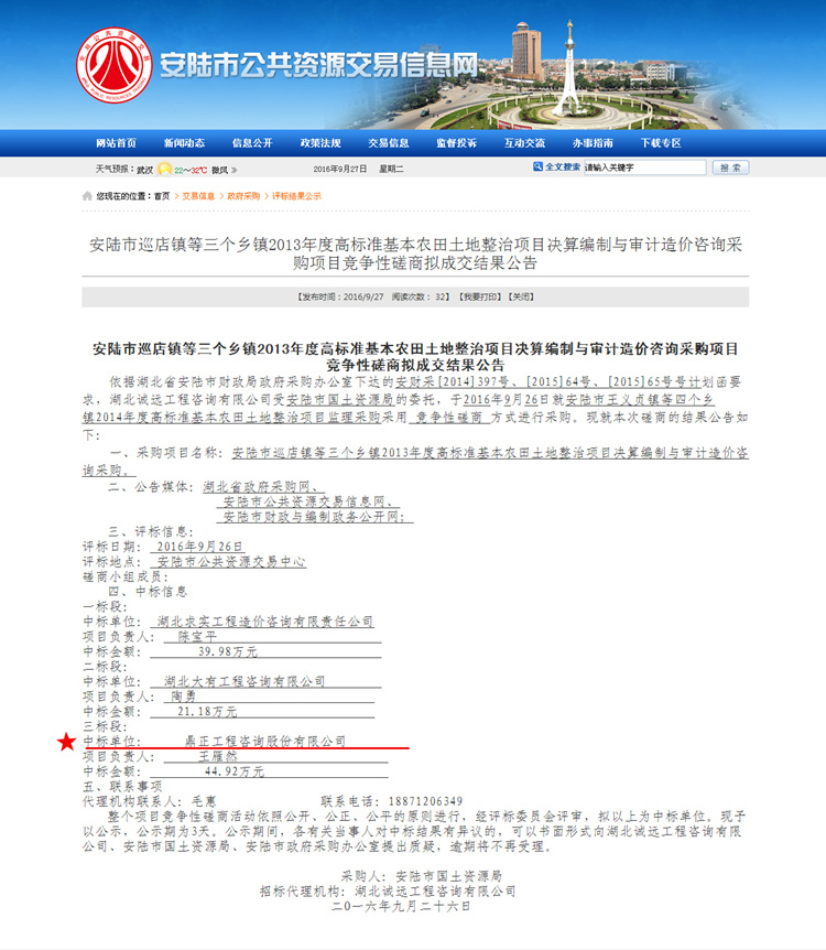 【經(jīng)營成果】我司中標安陸市巡店鎮(zhèn)等三個鄉(xiāng)鎮(zhèn)2013年度高標準基本農(nóng)田土地整治項目決算編制與審計造價咨詢采購項目
